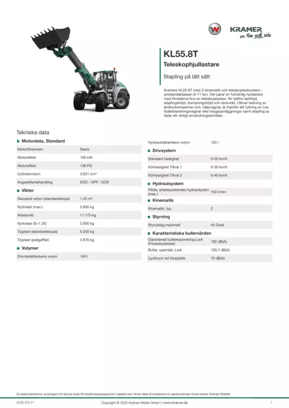 Kramers KL55.8T med Z-kinematik och teleskoplastsystem i prestandaklassen 9–11 ton. Det parar en fullvärdig hjullastare med fördelarna hos en teleskoplastare, för bättre lasthöjd, staplingshöjd, dumpningshöjd och räckvidd. Utöver lastning av lantbruksmaskiner och -släpvagnar, är framför allt fyllning av t.ex. foderblandningsvagnar eller biogasanläggningar samt stapling av balar ett viktigt användningsområde.