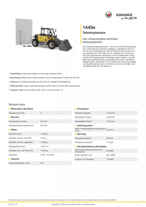 Den elektriska teleskoplastaren 1445e har ett 96V litiumjonbatteri som, beroende på utrustning, möjliggör en gångtid på upp till 4 timmar utan mellanladdning. Med en höjd på under 2 meter och en bredd på cirka 1,60 meter och en nyttolast på 1 450 kg har den även imponerande prestanda. För den helelektriska 1445e innebär CO2-begränsningar inte längre något problem, och det gäller även partikelutsläpp, gränsvärden och buller i framtidens dagliga arbete. Hjullastaren 1445e arbetar helt utan lokalt utsläpp och skyddar därmed miljö och förare och är även det rätta valet vad gäller effektivitet och ekonomi.