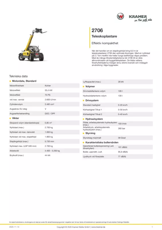 När det handlar om en staplingshöjd kring 6,0 m är teleskoplastaren 2706 den optimala lösningen. Med en nyttolast på 2,7 ton medför inte heller tunga lastförlopp några problem. Med de många tillvalsmöjligheterna blir 2706 till en äkta allroundmaskin på byggarbetsplatsen. De båda valbara förarhyttshöjderna medger ännu större översikt och möjliggör användning i låga byggnader.