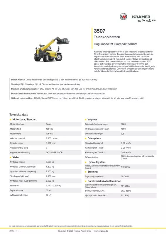 Kramers teleskoplastare 3507 är den idealiska teleskoplastaren för mångsidiga insatser. Teleskoplastaren är kompakt byggd, är låg och har liten vändradie. Trots sina mått är den tack vare staplingshöjden på 7,0 m och 3,5 tons nyttolast användbar på olika ställen. För maximal ekonomi hos teleskoplastaren 3507 sörjer det steglösa drivsystemet till maximalt 40 km/h, det lastavkännande hydraulsystemet på 140 l/min och det intelligenta förarassistanssystemet. Dessutom ombesörjer den ergonomiska och funktionella förarhytten ett stressfritt arbete.