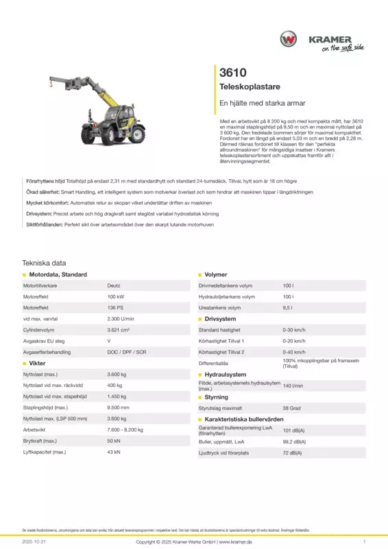 Med en arbetsvikt på 8 200 kg och med kompakta mått, har 3610 en maximal staplingshöjd på 9,50 m och en maximal nyttolast på 3 600 kg. Den tredelade bommen sörjer för maximal kompakthet. Fordonet har en längd på endast 5,03 m och en bredd på 2,28 m. Därmed räknas fordonet till klassen för den “perfekta allroundmaskinen“ för mångsidiga insatser i Kramers teleskoplastarsortiment och uppskattas framför allt i återvinningssegmentet.