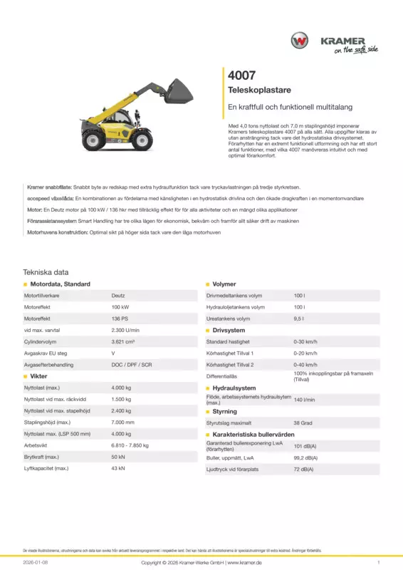 Med 4,0 tons nyttolast och 7,0 m staplingshöjd imponerar Kramers teleskoplastare 4007 på alla sätt. Alla uppgifter klaras av utan ansträngning tack vare det hydrostatiska drivsystemet. Förarhytten har en extremt funktionell utformning och har ett stort antal funktioner, med vilka 4007 manövreras intuitivt och med optimal förarkomfort.