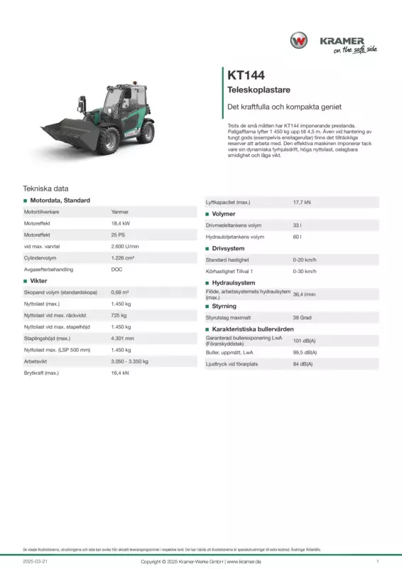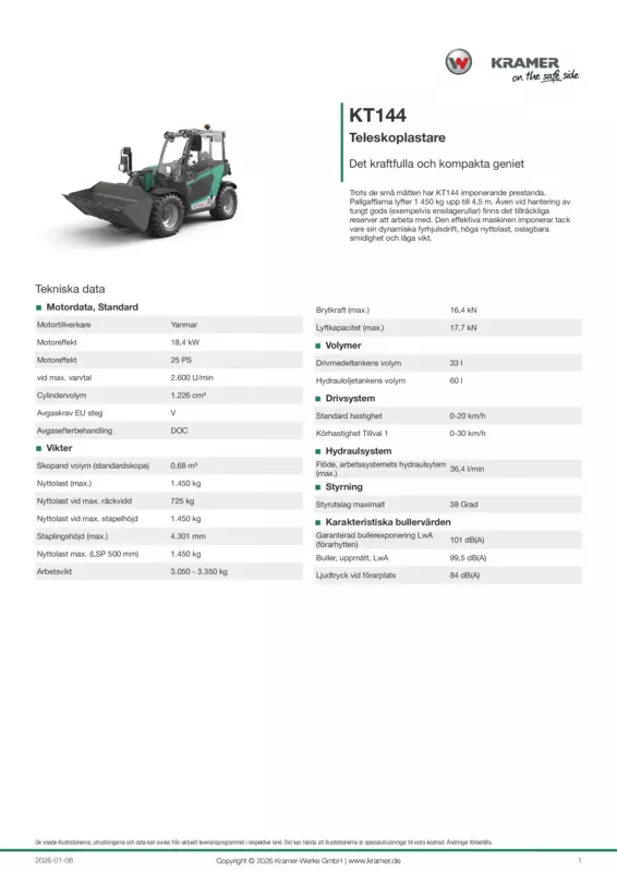 Trots de små måtten har KT144 imponerande prestanda. Pallgafflarna lyfter 1 450 kg upp till 4,5 m. Även vid hantering av tungt gods (exempelvis ensilagerullar) finns det tillräckliga reserver att arbeta med. Den effektiva maskinen imponerar tack vare sin dynamiska fyrhjulsdrift, höga nyttolast, oslagbara smidighet och låga vikt.
