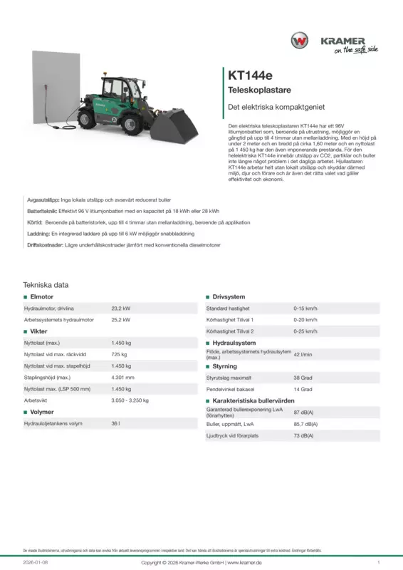 Den elektriska teleskoplastaren KT144e har ett 96V litiumjonbatteri som, beroende på utrustning, möjliggör en gångtid på upp till 4 timmar utan mellanladdning. Med en höjd på under 2 meter och en bredd på cirka 1,60 meter och en nyttolast på 1 450 kg har den även imponerande prestanda. För den helelektriska KT144e innebär utsläpp av CO2, partiklar och buller inte längre något problem i det dagliga arbetet. Hjullastaren KT144e arbetar helt utan lokalt utsläpp och skyddar därmed miljö, djur och förare och är även det rätta valet vad gäller effektivitet och ekonomi.