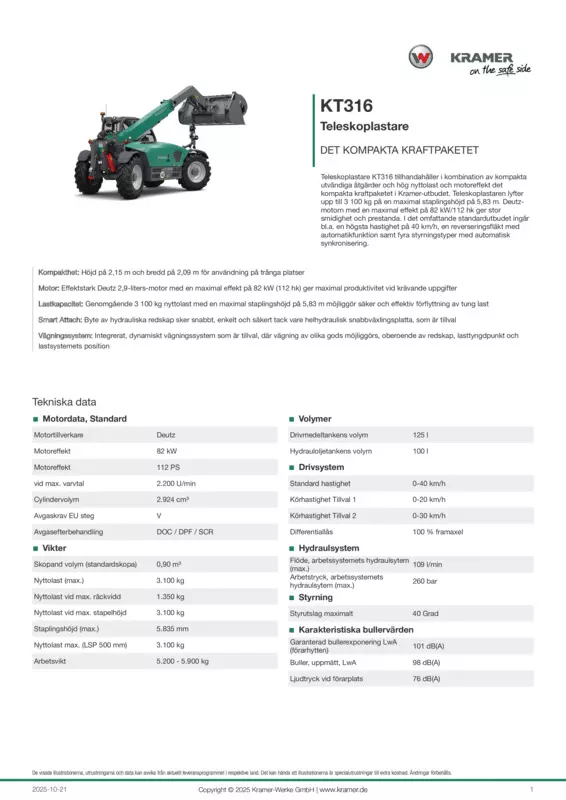Teleskoplastare KT316 tillhandahåller i kombination av kompakta utvändiga åtgärder och hög nyttolast och motoreffekt det kompakta kraftpaketet i Kramer-utbudet. Teleskoplastaren lyfter upp till 3 100 kg på en maximal staplingshöjd på 5,83 m. Deutz-motorn med en maximal effekt på 82 kW/112 hk ger stor smidighet och prestanda. I det omfattande standardutbudet ingår bl.a. en högsta hastighet på 40 km/h, en reverseringsfläkt med automatikfunktion samt fyra styrningstyper med automatisk synkronisering.