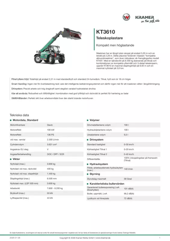 Maskinen har en längd (utan skopa) på endast 5,03 m och en bredd på 2,28 m. Detta placerar fordonet i klassen "kompakta allroundmaskiner", som även inkluderar vår framgångsrika modell KT407. Med en tjänstevikt på 8 200 kg (beroende på tillval) och kombinationen av kompakta yttermått och 3-delad teleskoparm, uppnår KT3610 en maximal staplingshöjd på 9,50 m och en maximal nyttolast på 3,6 ton.