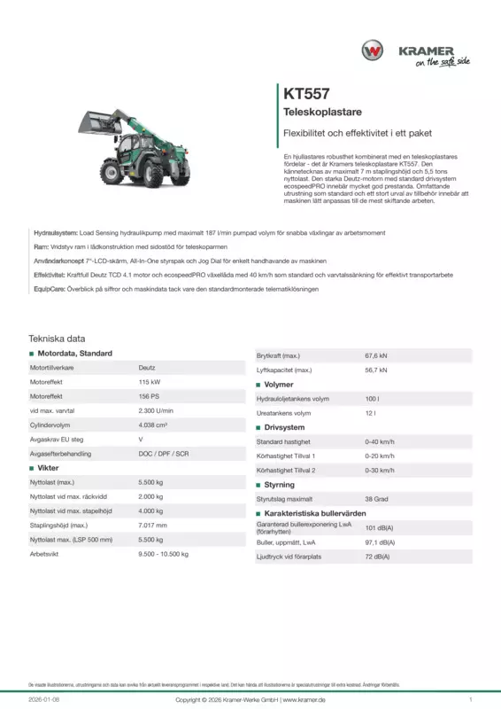 En hjullastares robusthet kombinerat med en teleskoplastares fördelar - det är Kramers teleskoplastare KT557. Den kännetecknas av maximalt 7 m staplingshöjd och 5,5 tons nyttolast. Den starka Deutz-motorn med standard drivsystem ecospeedPRO innebär mycket god prestanda. Omfattande utrustning som standard och ett stort urval av tillbehör innebär att maskinen lätt anpassas till de mest skiftande arbeten.