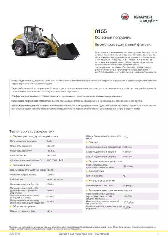 При проектировании колесного погрузчика Kramer 8155 на первый план неизменно ставились потребности клиента. Он впечатляет продуманными деталями и техническими инновациями, например, 7-дюймовый ЖК-дисплей со встроенной камерой заднего вида, климат-контроль и система автоматического возврата ковша. Эргономичность кабины обеспечивает эффективную работу оператора, а производительный двигатель — необходимую мощность для ежедневного использования.