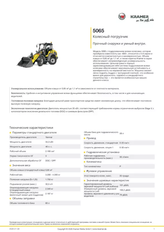 Модель 5065 с подруливанием всеми колесами, которая приобрела известность как «650», относится к 5-й серии и отличается компактностью и маневренностью. Объем ковша от 0,65 м³ до 1,1 м³, а также каретка Kramer в серии обеспечивают непревзойденную универсальность использования. Цельная рама и хорошо зарекомендовавшая себя система подруливания всеми колесами обеспечивают максимальную устойчивость и маневренность на неровной местности. Машина сможет легко поднять поддон с тротуарной плиткой, что особенно важно для дорожного, садового и ландшафтного строительства — это является особенностью машин данного класса.