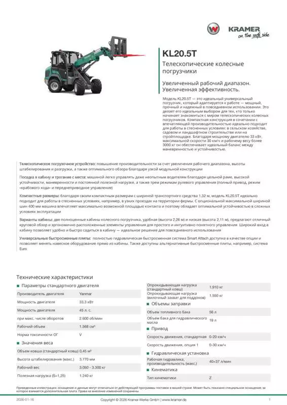 Модель KL20.5T — это идеальный универсальный погрузчик, который адаптируется к работе — мощный, прочный и надежный в повседневном использовании. Это делает его идеальным выбором для тех, кто только начинает знакомиться с миром телескопических колесных погрузчиков. Компактная конструкция в сочетании с впечатляющей производительностью идеально подходит для работы в стесненных условиях: в сельском хозяйстве, садовом и ландшафтном строительстве или на стройплощадке. Благодаря мощному двигателю 33 кВт, максимальной скорости 30 км/ч и рабочему весу более 3000 кг он обеспечивает идеальный баланс между маневренностью и устойчивостью.