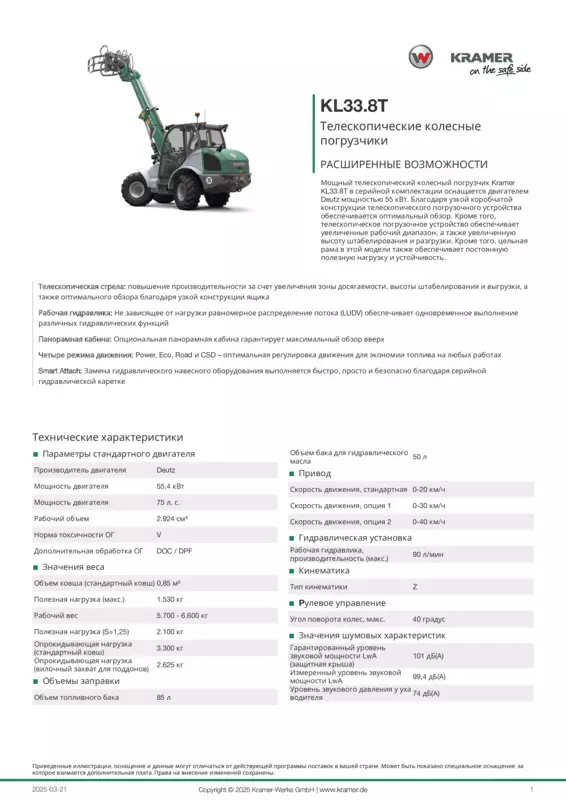 Мощный телескопический колесный погрузчик Kramer KL33.8T в серийной комплектации оснащается двигателем Deutz мощностью 55 кВт. Благодаря узкой коробчатой конструкции телескопического погрузочного устройства обеспечивается оптимальный обзор. Кроме того, телескопическое погрузочное устройство обеспечивает увеличенные рабочий диапазон, а также увеличенную высоту штабелирования и разгрузки. Кроме того, цельная рама в этой модели также обеспечивает постоянную полезную нагрузку и устойчивость.