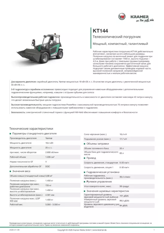 Рабочие характеристики погрузчика KT144 действительно впечатляют, несмотря на его небольшие размеры. Полезная нагрузка на вилочный захват для поддонов при штабелировании составляет 1450 кг, высота подъема – 4,5 м. Даже при работе с тяжелыми грузами (например, силосными тюками) сохраняется достаточный запас для большого рабочего диапазона. Эффективная машина подкупает своим динамичным приводом ходовой части, высокой полезной нагрузкой, непревзойденной маневренностью и малым рабочим весом.