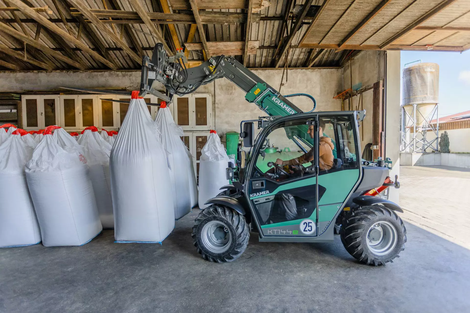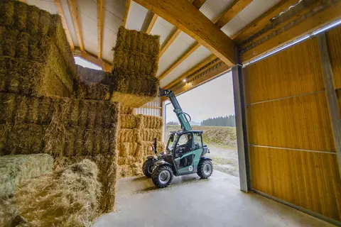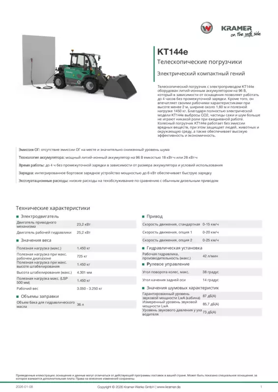 Телескопический погрузчик с электроприводом KT144e оборудован литий-ионным аккумулятором на 96 В, который в зависимости от оснащения позволяет работать до 4 часов без промежуточной зарядки. Кроме того, он впечатляет своими рабочими характеристиками при высоте менее 2 м, ширине около 1,60 м и полезной нагрузке 1450 кг. Благодаря полностью электрической модели KT144e выбросы CO2, частицы сажи и шум больше не играют никакой роли при ежедневной работе. Колесный погрузчик KT144e работает без эмиссии вредных веществ, при этом защищает людей, животных и окружающую среду, а также обеспечивает высокую эффективность и экономичность.