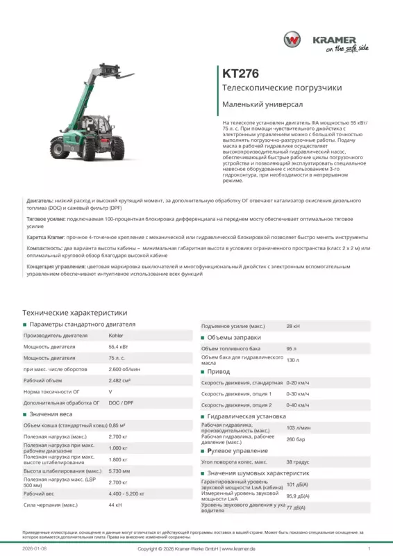 На телескопе установлен двигатель IIIA мощностью 55 кВт/75 л. с. При помощи чувствительного джойстика с электронным управлением можно с большой точностью выполнять погрузочно-разгрузочные работы. Подачу масла в рабочей гидравлике осуществляет высокопроизводительный гидравлический насос, обеспечивающий быстрые рабочие циклы погрузочного устройства и позволяющий эксплуатировать специальное навесное оборудование с использованием 3-го гидроконтура, при необходимости в непрерывном режиме.