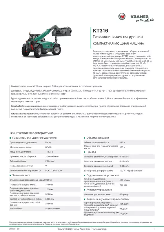 Благодаря сочетанию компактных габаритов, высокой полезной нагрузки и мощности двигателя телескопический погрузчик KT316 является компактной мощной машиной в портфолио Kramer. Он поднимает до 3100 кг на максимальную высоту штабелирования 5,83 м. Двигатель Deutz с максимальной мощностью 82 кВт / 112 л. с. обеспечивает высокую динамичность и производительность машины. Широкая стандартная комплектация включает в себя максимальную скорость 40 км/ч, реверсивный вентилятор с автоматической функцией и четыре режима рулевого управления с автоматической синхронизацией.