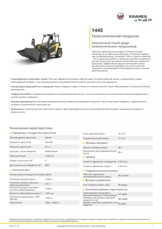 Рабочие характеристики модели 1445 впечатляют, несмотря на ее небольшие размеры. Полезная нагрузка при штабелировании составляет 1450 кг, высота подъема – 4,5 м. Даже при работе с тяжелыми грузами сохраняется достаточный запас для обеспечения большого рабочего диапазона. Эффективная машина впечатляет своим динамичным полным приводом, высокой полезной нагрузкой, непревзойденной маневренностью и низким рабочим весом.