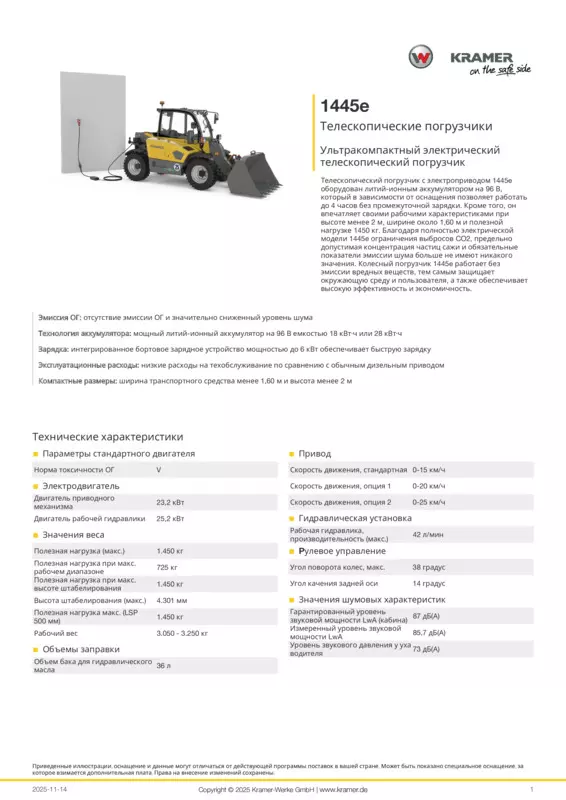 Телескопический погрузчик с электроприводом 1445e оборудован литий-ионным аккумулятором на 96 В, который в зависимости от оснащения позволяет работать до 4 часов без промежуточной зарядки. Кроме того, он впечатляет своими рабочими характеристиками при высоте менее 2 м, ширине около 1,60 м и полезной нагрузке 1450 кг. Благодаря полностью электрической модели 1445e ограничения выбросов CO2, предельно допустимая концентрация частиц сажи и обязательные показатели эмиссии шума больше не имеют никакого значения. Колесный погрузчик 1445e работает без эмиссии вредных веществ, тем самым защищает окружающую среду и пользователя, а также обеспечивает высокую эффективность и экономичность.