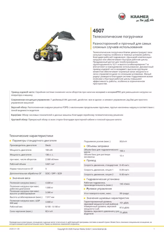 Телескопические погрузчики Kramer демонстрируют свои сильные стороны особенно в тяжелых условиях работы. Благодаря рабочей гидравлике с функцией компенсации нагрузки они обеспечивают быстрые рабочие циклы. Продуманный доступ для техобслуживания, грузоподъемность 4,5 т и высота штабелирования 7 м впечатляют в повседневном использовании. Динамичный привод ходовой части ecospeed с высоким крутящим моментом обеспечивает огромный запас мощности и легко справляется даже со сложными условиями. Малый радиус разворота благодаря системе подруливания всеми колесами и быстрые рабочие циклы повышают эффективность работы, особенно в ограниченном пространстве.