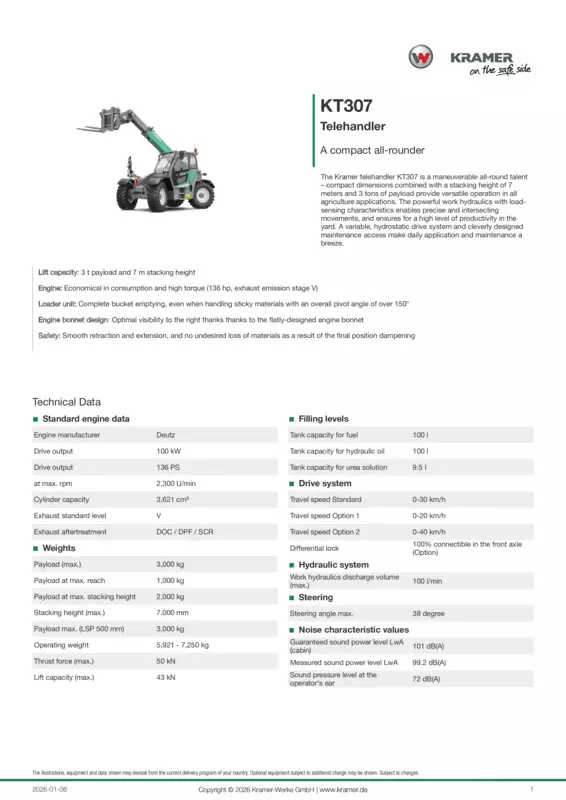 Brochure Kramer telehandlers up to 9.50 m stacking height KT356/KT307/KT357/KT407/KT3610/KT457/KT557/KT559