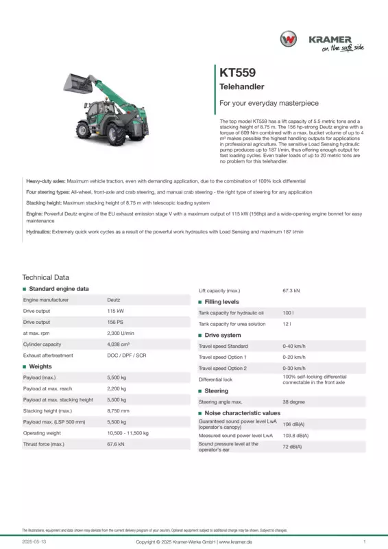 The top model KT559 has a lift capacity of 5.5 metric tons and a stacking height of 8.75 m. The 156 hp-strong Deutz engine with a torque of 609 Nm combined with a max. bucket volume of up to 4 m³ makes possible the highest handling outputs for applications in professional agriculture. The sensitive Load Sensing hydraulic pump produces up to 187 l/min, thus offering enough output for fast loading cycles. Even trailer loads of up to 20 metric tons are no problem for this telehandler.