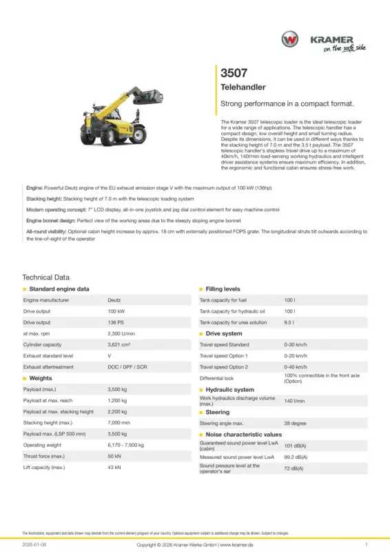 The Kramer 3507 telescopic loader is the ideal telescopic loader for a wide range of applications. The telescopic handler has a compact design, low overall height and small turning radius. Despite its dimensions, it can be used in different ways thanks to the stacking height of 7.0 m and the 3.5 t payload. The 3507 telescopic handler's stepless travel drive up to a maximum of 40km/h, 140l/min load-sensing working hydraulics and intelligent driver assistance systems ensure maximum efficiency. In addition, the ergonomic and functional cabin ensures stress-free work.