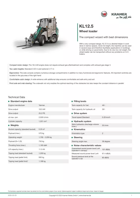 With a very compact design, KL12.5 is a desired helper in work done in narrow spaces. Given its height, the machine can be used in several ways and therefore facilitates applications in buildings or while driving on pavements. Due to its very low net weight, the wheel loader can be transported without any problems on 3.5 t trailers.
