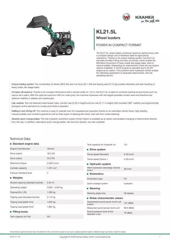 The KL21.5L wheel loader combines maximum performance with a compact design and is therefore ideal for agricultural operations. Thanks to its unique loading system, the KL21.5L provides excellent lifting and tear out forces, which enable the effortless movement of heavy loads like silage bales, feed or manure pallets. Depending on requirements, there are two engine options available: a 19 kW engine as standard and a 33 kW engine as an option. The powerful work hydraulics further enable the effortless application of specialist attachments, like the spreading device.