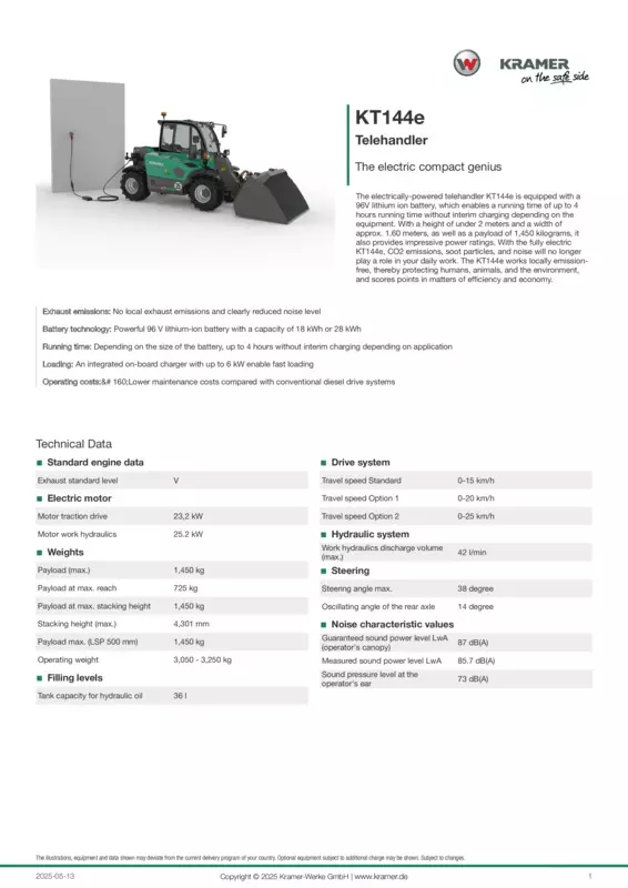 The electrically-powered telehandler KT144e is equipped with a 96V lithium ion battery, which enables a running time of up to 4 hours running time without interim charging depending on the equipment. With a height of under 2 meters and a width of approx. 1.60 meters, as well as a payload of 1,450 kilograms, it also provides impressive power ratings. With the fully electric KT144e, CO2 emissions, soot particles, and noise will no longer play a role in your daily work. The KT144e works locally emission-free, thereby protecting humans, animals, and the environment, and scores points in matters of efficiency and economy.
