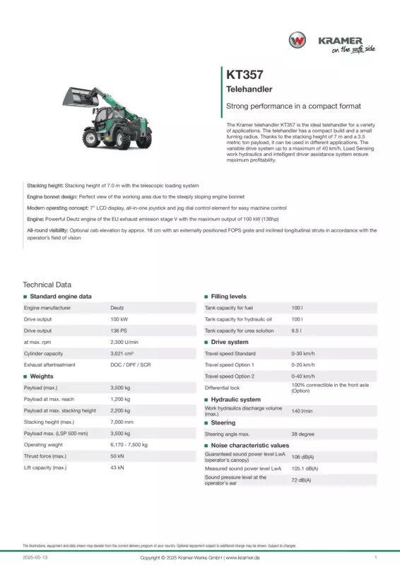 The Kramer telehandler KT357 is the ideal telehandler for a variety of applications. The telehandler has a compact build and a small turning radius. Thanks to the stacking height of 7 m and a 3.5 metric ton payload, it can be used in different applications. The variable drive system up to a maximum of 40 km/h, Load Sensing work hydraulics and intelligent driver assistance system ensure maximum profitability.