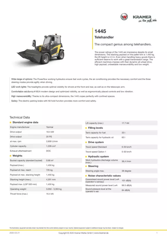 The power ratings of the 1445 are impressive despite its small dimensions. The stacking payload on the pallet fork is 1,450 kg, the lift height is 4.3 m. Even when handling heavy goods there is sufficient reserve to work with a great transmission range. The efficient machines impress with their dynamic all-wheel drive, high payload, unbeatable manoeuvrability and low weight.