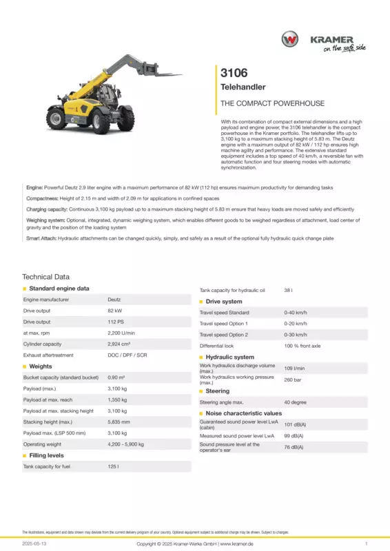 With its combination of compact external dimensions and a high payload and engine power, the 3106 telehandler is the compact powerhouse in the Kramer portfolio. The telehandler lifts up to 3,100 kg to a maximum stacking height of 5.83 m. The Deutz engine with a maximum output of 82 kW / 112 hp ensures high machine agility and performance. The extensive standard equipment includes a top speed of 40 km/h, a reversible fan with automatic function and four steering modes with automatic synchronization.