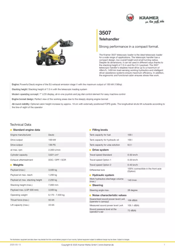 The Kramer 3507 telescopic loader is the ideal telescopic loader for a wide range of applications. The telescopic handler has a compact design, low overall height and small turning radius. Despite its dimensions, it can be used in different ways thanks to the stacking height of 7.0 m and the 3.5 t payload. The 3507 telescopic handler's stepless travel drive up to a maximum of 40km/h, 140l/min load-sensing working hydraulics and intelligent driver assistance systems ensure maximum efficiency. In addition, the ergonomic and functional cabin ensures stress-free work.