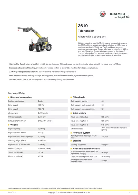 With an operating weight of 8,200 kg and compact dimensions, the 3610 achieves a maximum stacking height of 9.50 m and a maximum payload of 3,600 kg. The 3-part boom ensures maximum compactness. The vehicle has a length of only 5.03 m and is 2.28 m wide. The vehicle thus belongs to the class of "perfect all-rounders" for versatile use in the Kramer telescopic handler portfolio and is particularly popular in recycling.