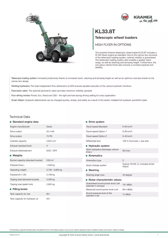 The powerful Kramer telescopic wheel loader KL33.8T includes a 55 kW Deutz engine as standard. Due to the narrow box structure of the telescopic loading system, optimal visibility is guaranteed. The telescopic loading system also enables a greater reach range, as well as stacking and dumping height. Furthermore, the one-piece vehicle frame also ensures a constant payload and stability.