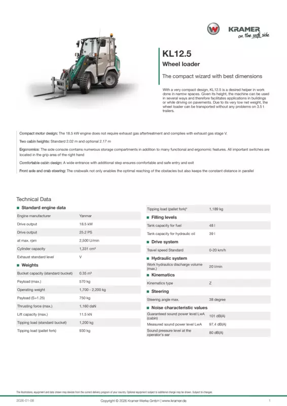 With a very compact design, KL12.5 is a desired helper in work done in narrow spaces. Given its height, the machine can be used in several ways and therefore facilitates applications in buildings or while driving on pavements. Due to its very low net weight, the wheel loader can be transported without any problems on 3.5 t trailers.