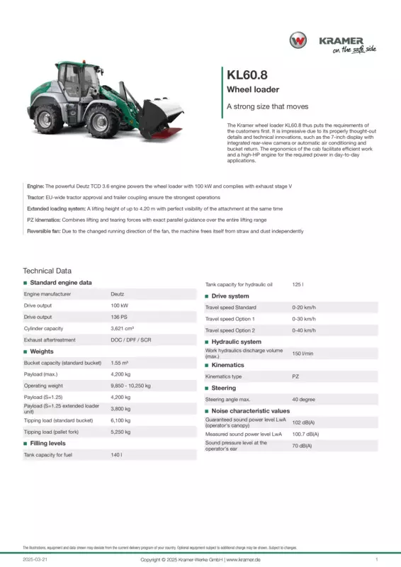 The brochure of the massive Kramer wheel and telescopic wheel loaders.