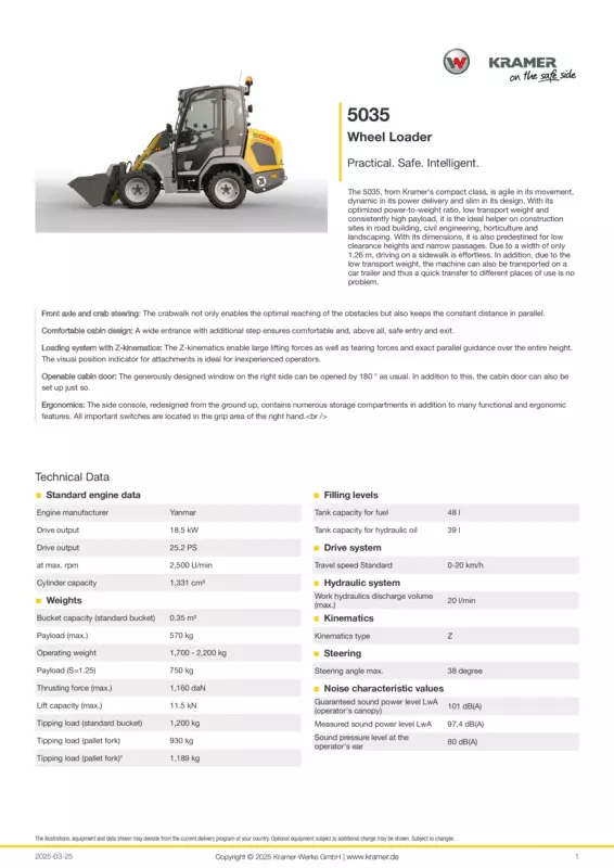 The 5035, from Kramer's compact class, is agile in its movement, dynamic in its power delivery and slim in its design. With its optimized power-to-weight ratio, low transport weight and consistently high payload, it is the ideal helper on construction sites in road building, civil engineering, horticulture and landscaping. With its dimensions, it is also predestined for low clearance heights and narrow passages. Due to a width of only 1.26 m, driving on a sidewalk is effortless. In addition, due to the low transport weight, the machine can also be transported on a car trailer and thus a quick transfer to different places of use is no problem.
